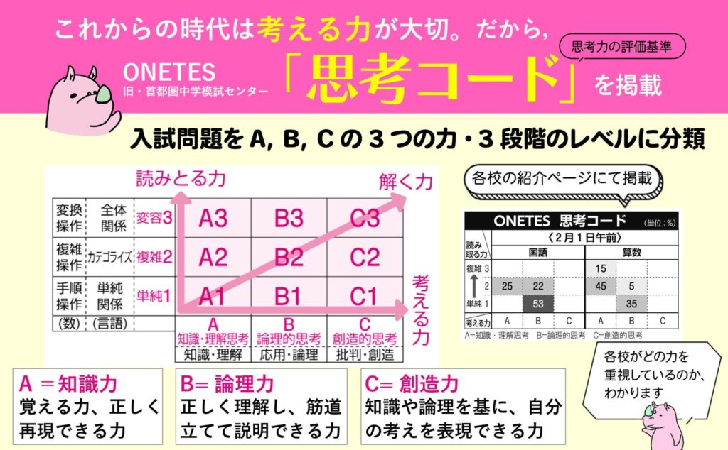 ONETES(旧・首都圏模試センター) の「思考コード」は,総合的な学力を評価するフレームワーク。従来の点数評価では“ 見えない学力” とされた「思考力・表現力・創造力」のレベルがわかります。