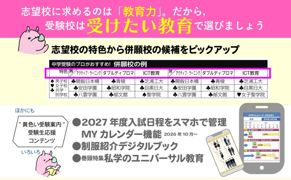 志望校はもちろん,併願校(受験校)も教育内容やその学校の特色,校風から選びたいですね。