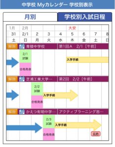 受験希望の入試日程を選択して「Myカレンダー」に登録すると,オリジナルの入試日程カレンダーができます。出願期間,入試日,手続き日,延納制度のあるなしなど,一覧で管理できる便利な機能となっています。